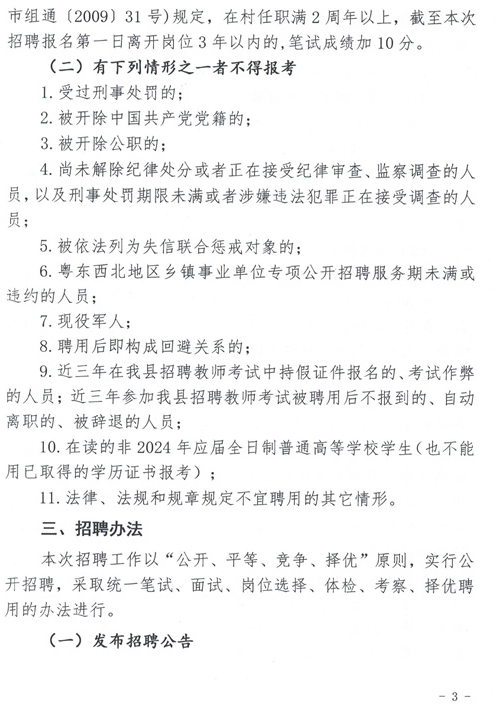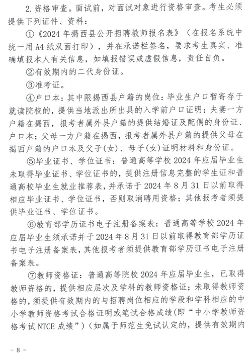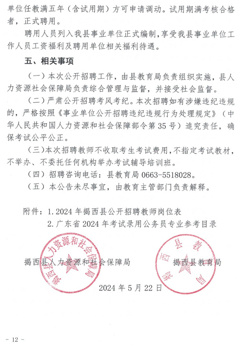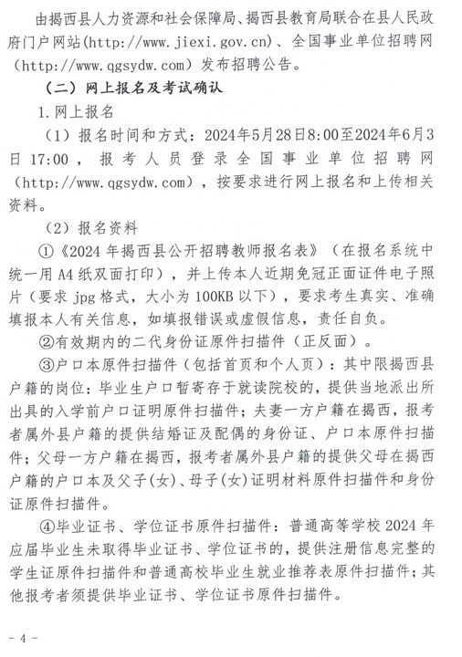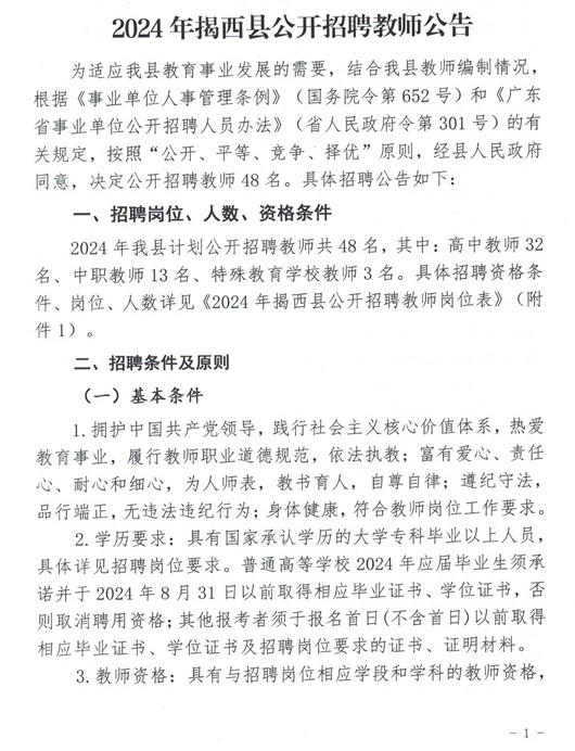 2024年我縣計劃公開招聘教師共48名,其中:高中教師32名、中職教師13名、特殊教育學(xué)校教師3名。具體招聘資格條件、崗位、人數(shù)詳見《2024年揭西縣公開招聘教師崗位表》(附件1)。
