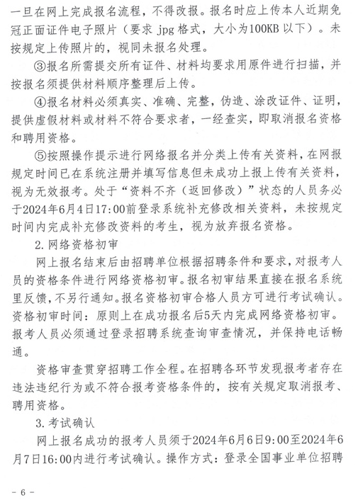 2.學(xué)歷要求:具有國家承認學(xué)歷的大學(xué)專科畢業(yè)以上人員,具體詳見招聘崗位要求。普通高等學(xué)校2024年應(yīng)屆畢業(yè)生須承諾并于2024 年8月31日以前取得相應(yīng)畢業(yè)證書、學(xué)位證書,否則取消聘用資格;其他報考者須于報名首日(不含首日)以前取得相應(yīng)畢業(yè)證書、學(xué)位證書及招聘崗位要求的證書、證明材料。