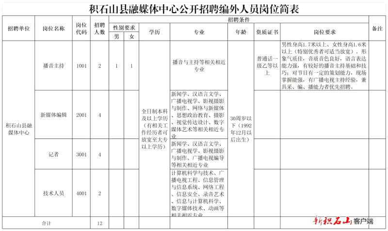 本次公開招聘臨聘人員共12名,詳見《積石山縣融媒體中心公開招聘編外人員崗位簡表》(以下簡稱《崗位簡表》)。