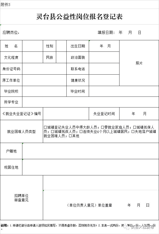 3.靈臺(tái)縣公益性崗位報(bào)名登記表