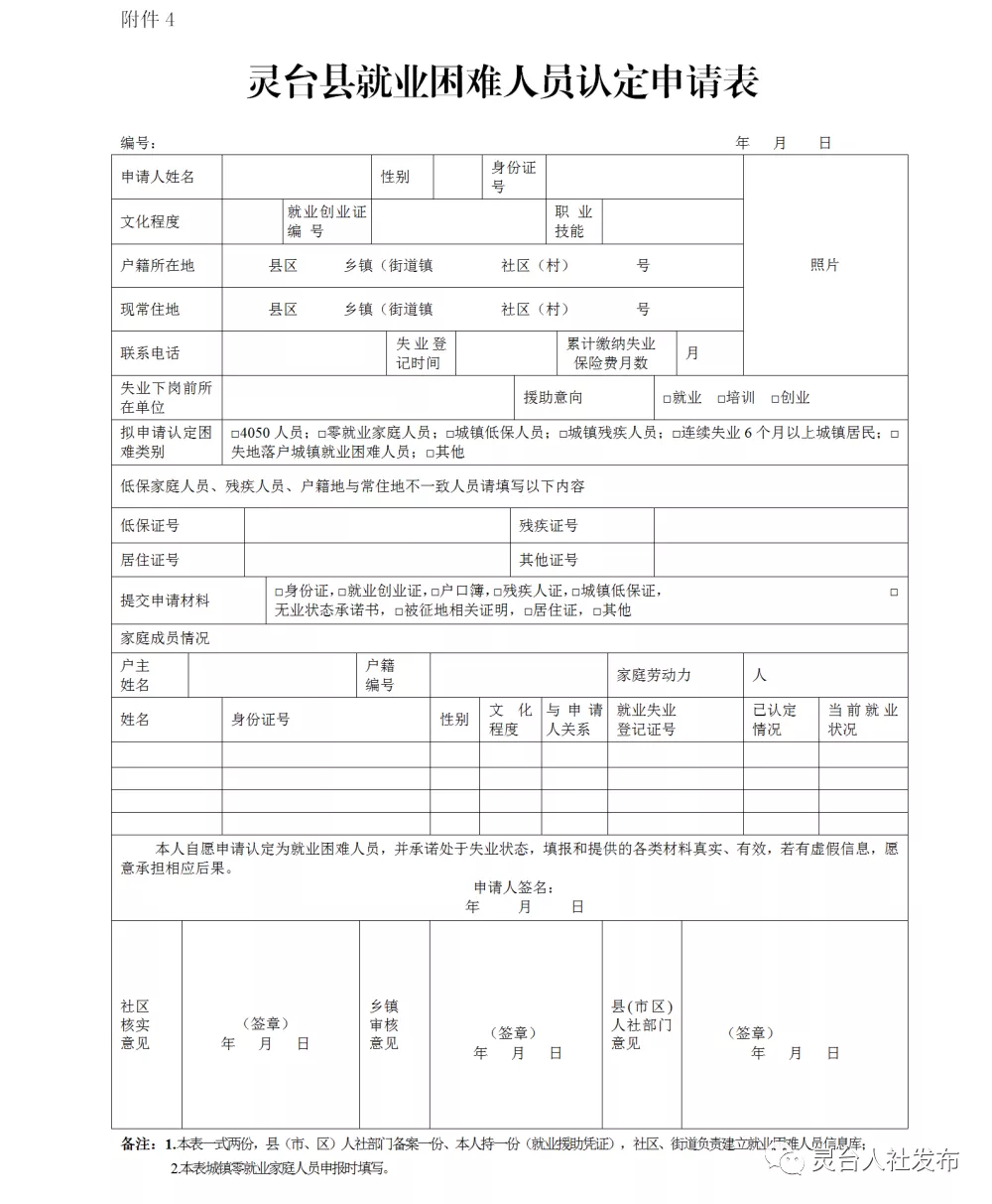 4.靈臺(tái)縣就業(yè)困難人員認(rèn)定申請表(此表零就業(yè)家庭人員提供,其余就業(yè)困難人員不提供)