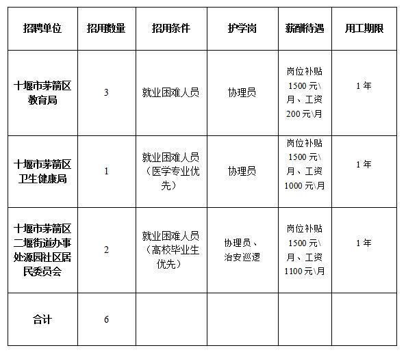 招聘公益性崗位工作人員共6名,從事協(xié)理員、護學崗等相關工作。