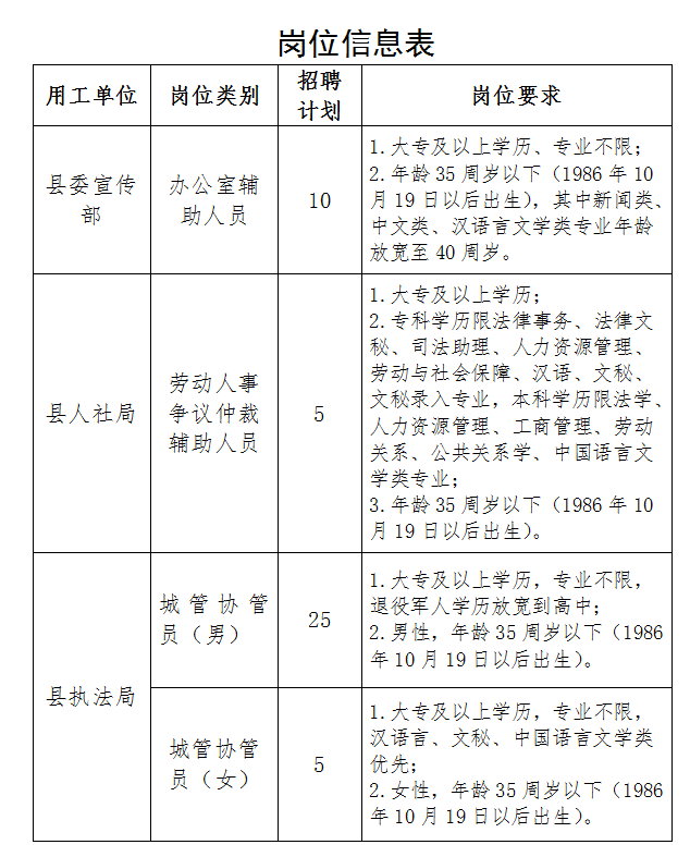 2022-10-14 22:11:06閱讀()安平縣人民政府因工作需要,中共安平縣委宣傳部招聘勞務(wù)派遣制工作人員10名,縣人社局招聘勞動人事爭議仲裁辦案輔助人員5名,縣城市管理綜合行政執(zhí)法局招聘城管協(xié)管員30名。為順利推進(jìn)招聘工作,現(xiàn)將有關(guān)事項(xiàng)公告如下: