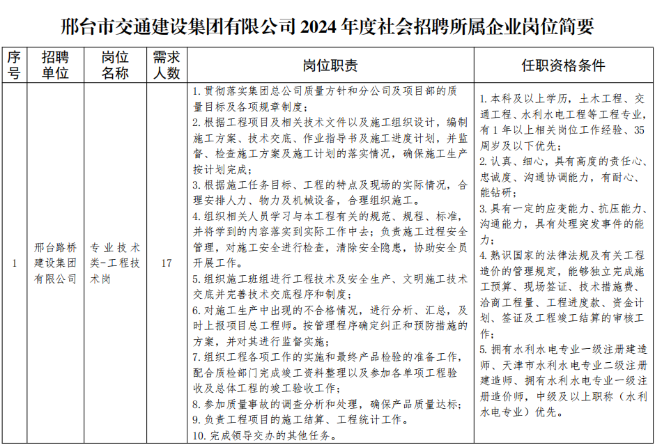 附件:邢臺市交通建設(shè)集團有限公司2024年度社會招聘所屬企業(yè)崗位簡要