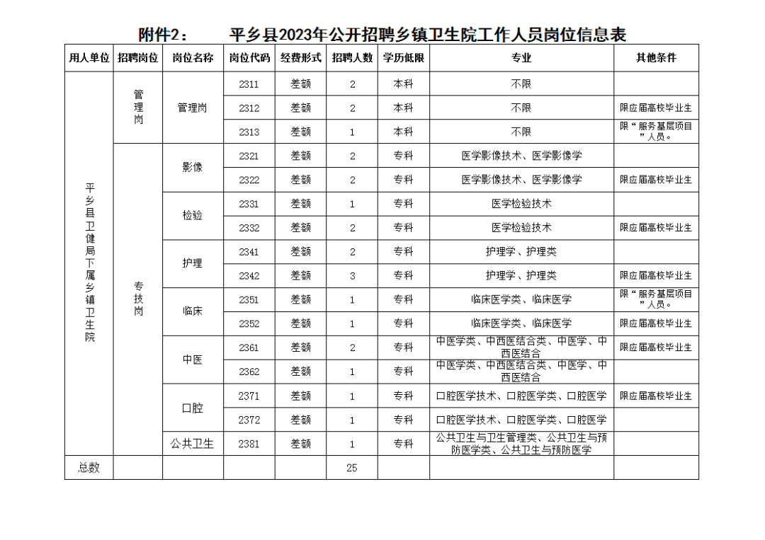 1.具體招聘人數(shù)和崗位條件詳見《平鄉(xiāng)縣2023年公開招聘鄉(xiāng)鎮(zhèn)衛(wèi)生院工作人員崗位信息表》(附件2),其中專業(yè)參考教育部《授予博士、碩士學(xué)位和培養(yǎng)研究生的學(xué)科、專業(yè)目錄》《普通高等學(xué)校本科專業(yè)目錄(2020年版)》設(shè)置。留學(xué)回國人員和其他海外、外國學(xué)歷學(xué)位獲得者的專業(yè)名稱與招聘崗位要求專業(yè)名稱不完全一致,但所學(xué)專業(yè)課程與招聘崗位專業(yè)課程大部分相同,且符合該崗位所需要的其他條件的,也可報考該招聘崗位。