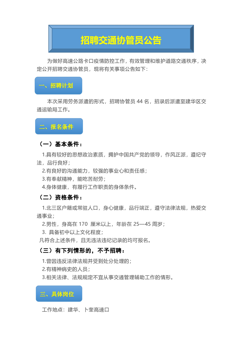 本次采用勞務(wù)派遣的形式,招聘協(xié)管員44名,招錄后派遣至建華區(qū)交通運輸局工作。