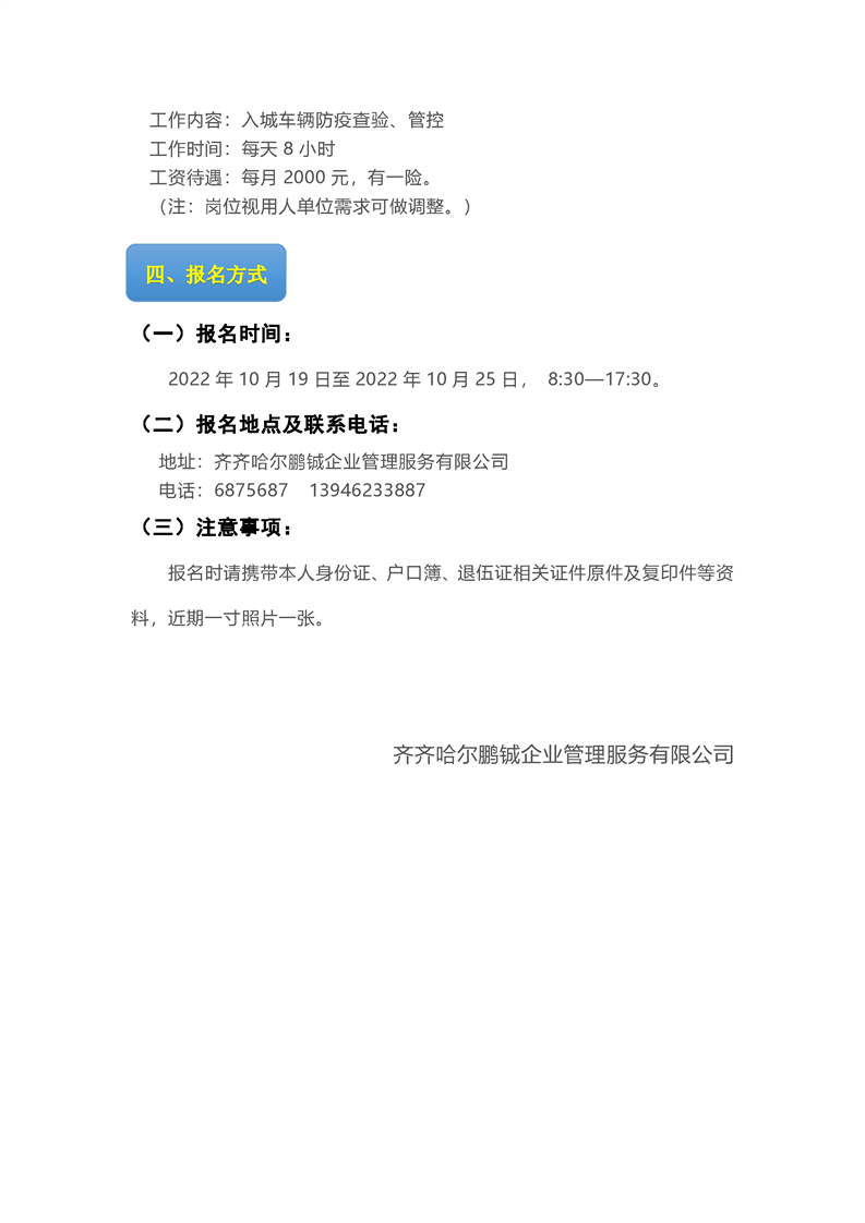 2022-10-21 22:56:46閱讀()齊齊哈爾市建華區(qū)人民政府為做好高速公路卡口疫情防控工作,有效管理和維護道路交通秩序,決定公開招聘交通協(xié)管員,現(xiàn)將有關(guān)事項公告如下: