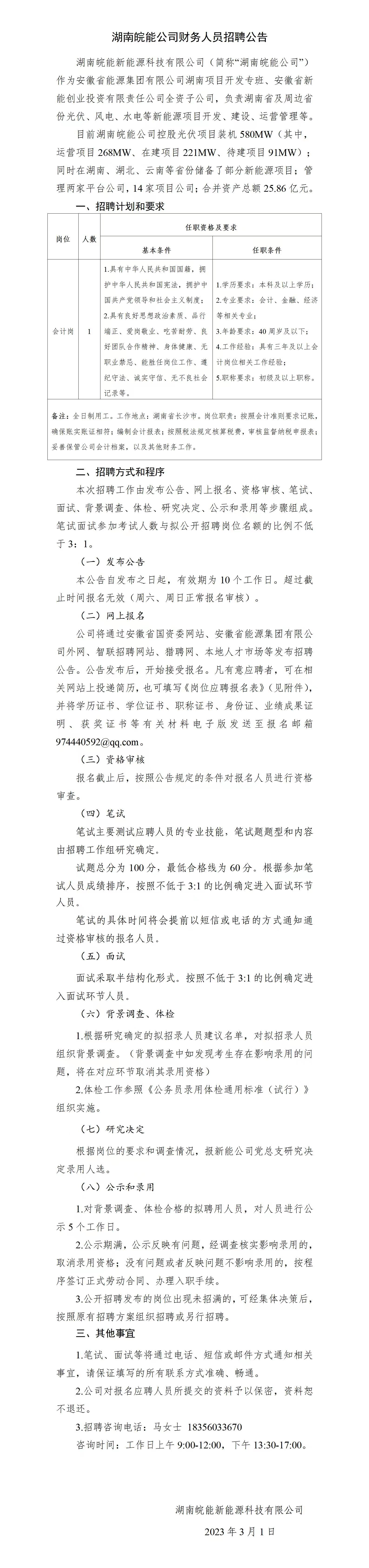 2023年湖南皖能公司財(cái)務(wù)人員招聘公告