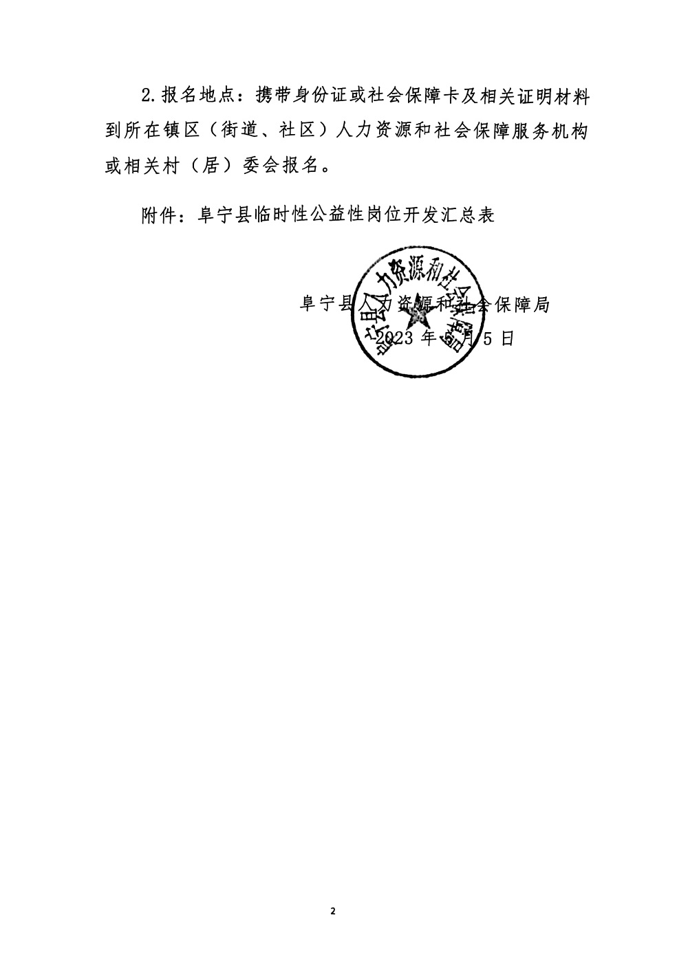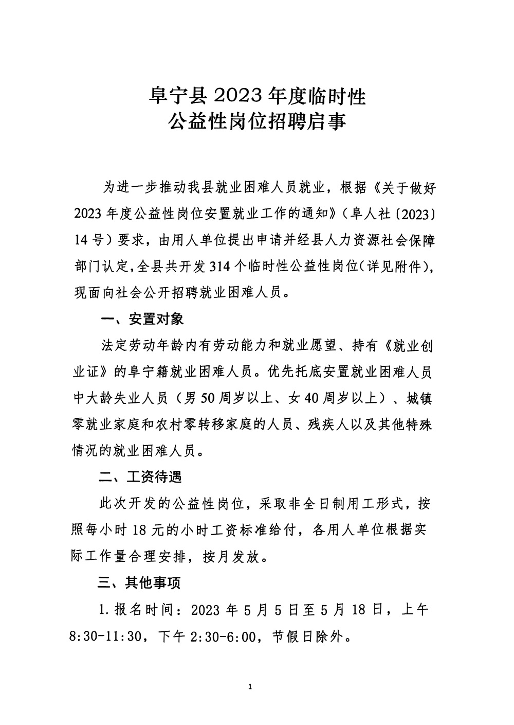 2023-05-06 16:23:32閱讀()阜寧縣人民政府為進一步推動我縣就業(yè)困難人員就業(yè),根據(jù)《關(guān)于做好2023年度公益性崗位安置就業(yè)工作的通知》(阜人社〔2023)14號)要求,由用人單位提出申請并經(jīng)縣人力資源社會保障部門認定,全縣共開發(fā)314個臨時性公益性崗位(詳見附件),現(xiàn)面向社會公開招聘就業(yè)困難人員。