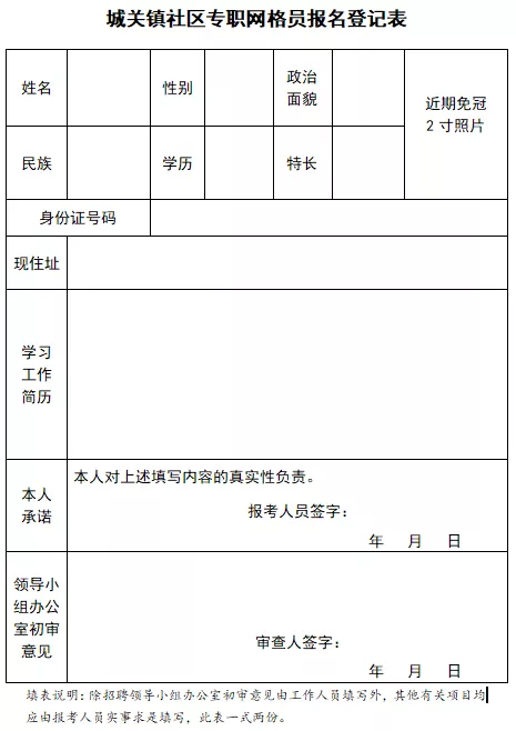 1.《城關(guān)鎮(zhèn)社區(qū)專職網(wǎng)格員報名登記表》一式二份;