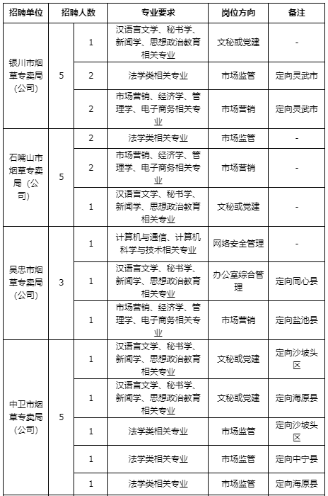 本次招聘公告通過中國煙草人才招聘平臺(http://www.tobacco.gov.cn/)、寧夏區(qū)煙草專賣局(公司)官網(wǎng)(https://nx.tobacco.gov.cn/)同時公開發(fā)布。