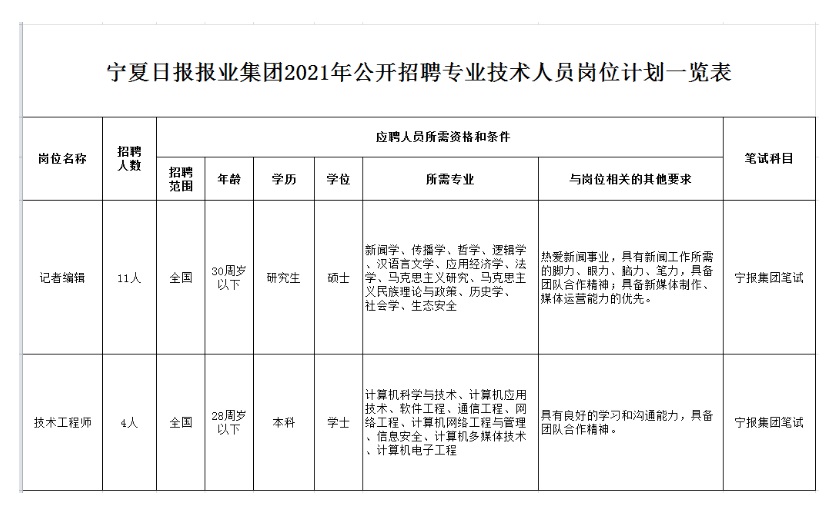 崗位要求詳見《寧夏日報(bào)報(bào)業(yè)集團(tuán)2021年公開招聘專業(yè)技術(shù)人員崗位計(jì)劃一覽表》(附件)。