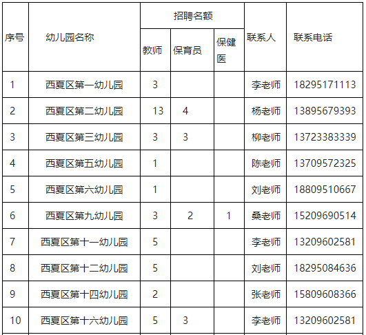 為不斷推進(jìn)西夏區(qū)學(xué)前教育優(yōu)質(zhì)發(fā)展,加強(qiáng)幼兒園教師隊伍建設(shè),經(jīng)研究決定,現(xiàn)面向社會公開招聘非在編幼兒園教師、保育員、保健醫(yī),共計166名(其中幼兒教師120名、保育員36名、保健醫(yī)10名)?,F(xiàn)將有關(guān)事項公告如下: