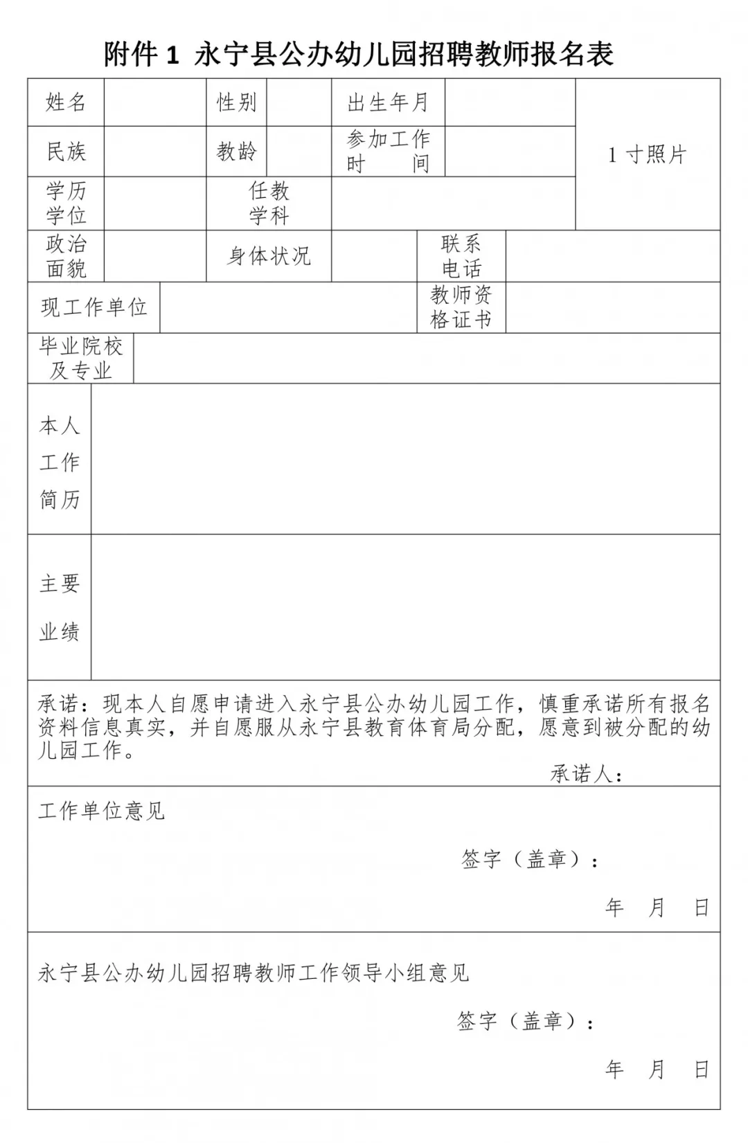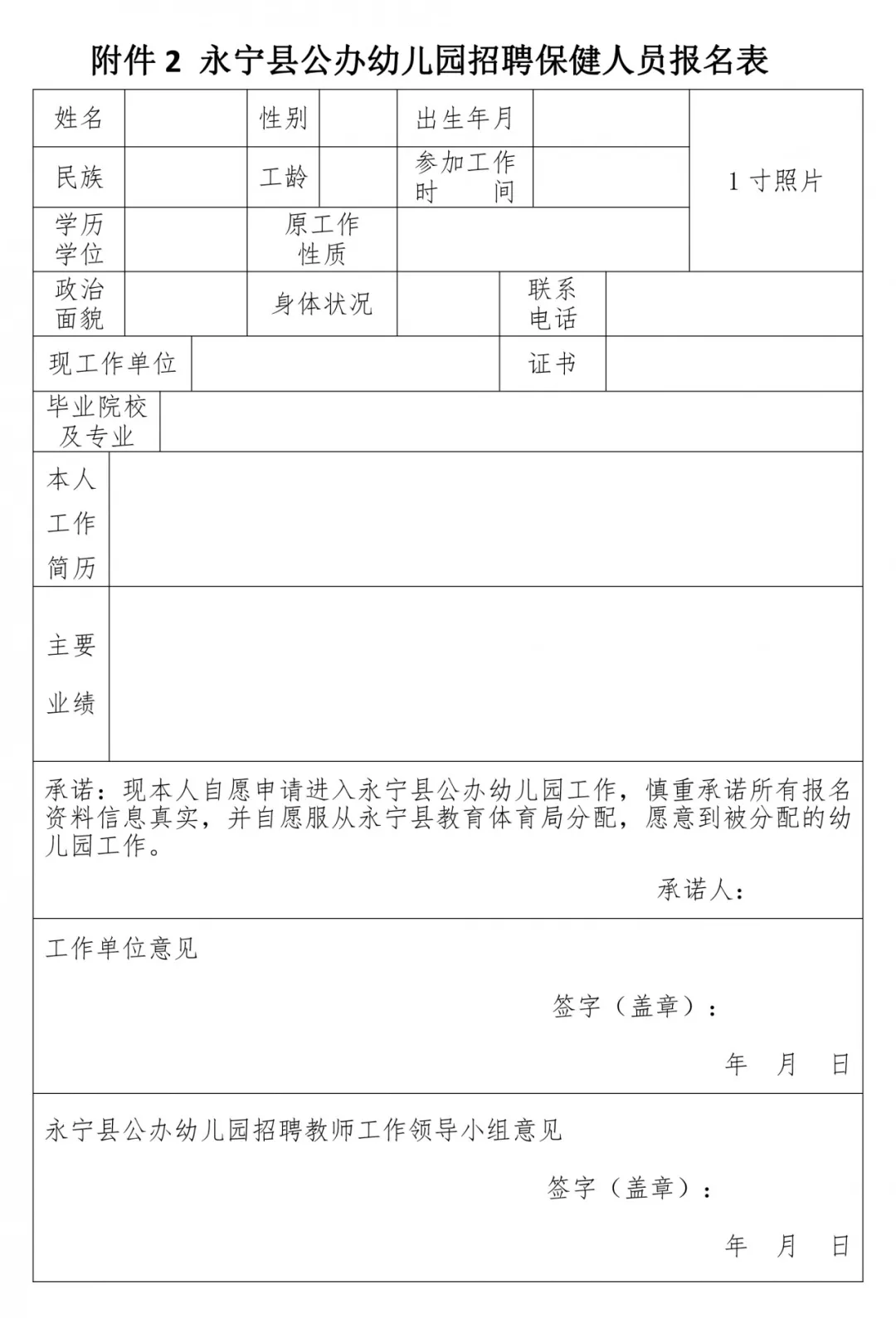 2、應(yīng)聘者填寫《永寧縣公辦幼兒園招聘教師報名表》(附件1)或《永寧縣公辦幼兒園招聘保健人員報名表》(附件2),并在規(guī)定時間內(nèi)報名。