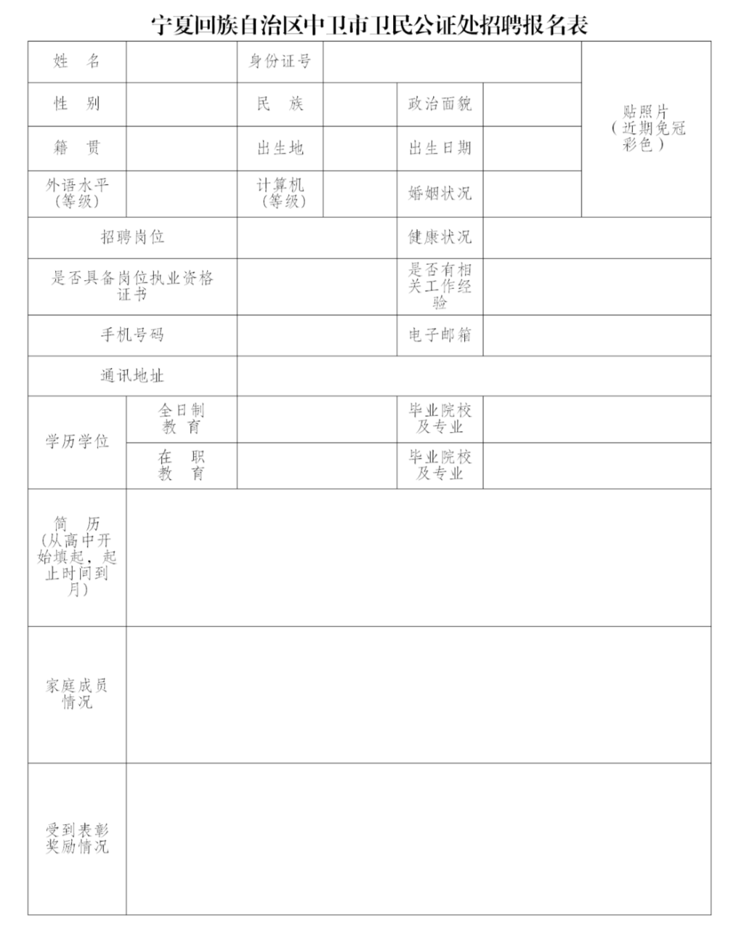 4.填寫《寧夏回族自治區(qū)中衛(wèi)市衛(wèi)民公證處招聘報(bào)名表》。