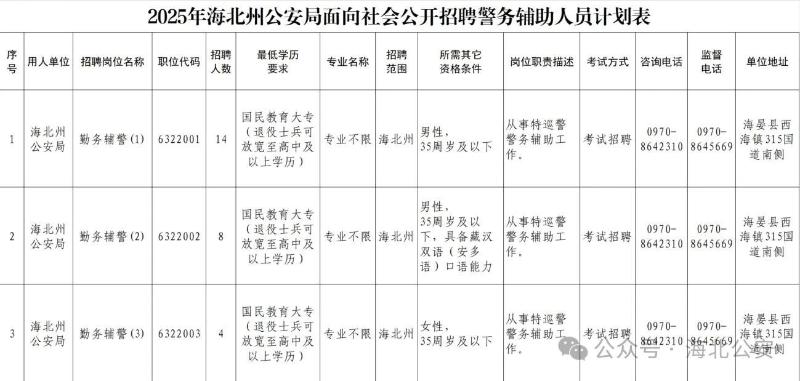 附:2025年海北州公安局面向社會(huì)公開招聘警務(wù)輔助人員計(jì)劃表