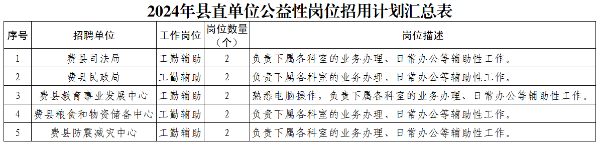 公益性崗位是指各級(jí)人民政府使用財(cái)政資金統(tǒng)一設(shè)置的非營(yíng)利性公共管理類(lèi)、公共服務(wù)類(lèi)、社會(huì)事業(yè)類(lèi)、設(shè)施維護(hù)類(lèi)、社會(huì)治理類(lèi)等崗位。2024年度費(fèi)縣計(jì)劃招聘城鎮(zhèn)公益性崗位10人(具體崗位見(jiàn)附件1)。
