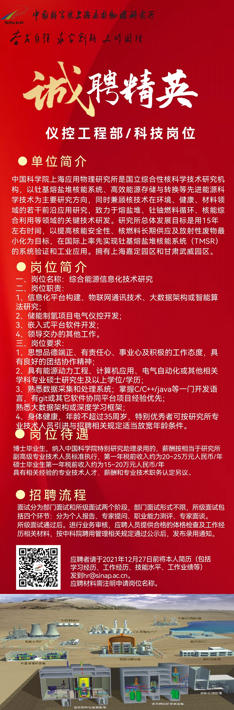 2021-12-23 23:00:03閱讀()中國科學(xué)院上海應(yīng)用物理研究所2021年上海應(yīng)物所儀控工程技術(shù)部崗位招聘啟事