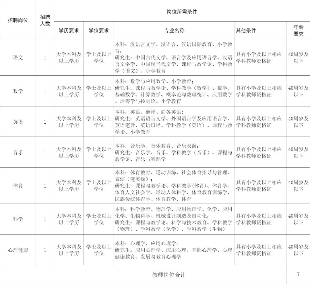 小學(xué)語文:5人、小學(xué)數(shù)學(xué):3人、小學(xué)英語:2人、小學(xué)體育:1人、小學(xué)音樂:1人、小學(xué)美術(shù):2人、小學(xué)道德與法治:1人 、小學(xué)信息技術(shù):1人、財(cái)務(wù):1人。