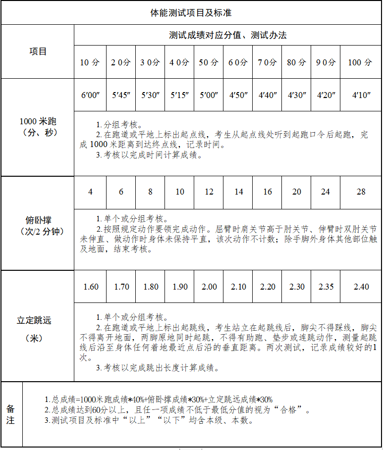 體能測試科目為1000米跑、俯臥撐、立定跳遠??偝煽冞_到60分以上,且任一項成績不低于最低分值的視為“合格”。消防員崗位和駕駛員崗位從事一線滅火救援工作,工作和訓(xùn)練強度高,建議身體存在任何等影響執(zhí)行日常訓(xùn)練及消防救援工作疾病的人員不宜報考。