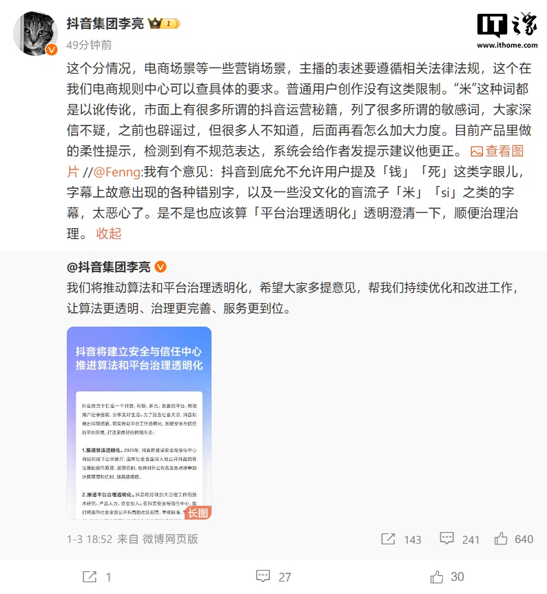 2025-01-07 11:02:40閱讀()互聯(lián)網(wǎng)1月3日,抖音集團(tuán)副總裁李亮發(fā)文宣布將推動(dòng)算法和平臺(tái)治理透明化,當(dāng)晚有網(wǎng)友評(píng)論提出意見:“抖音到底允不允許用戶提及‘錢’‘死’這類字眼,字幕上故意出現(xiàn)的各種錯(cuò)別字,以及一些沒文化的盲流子‘米’‘si’之類的字幕,太惡心了。是不是也應(yīng)該算‘平臺(tái)治理透明化’透明澄清一下,順便治理治理。”