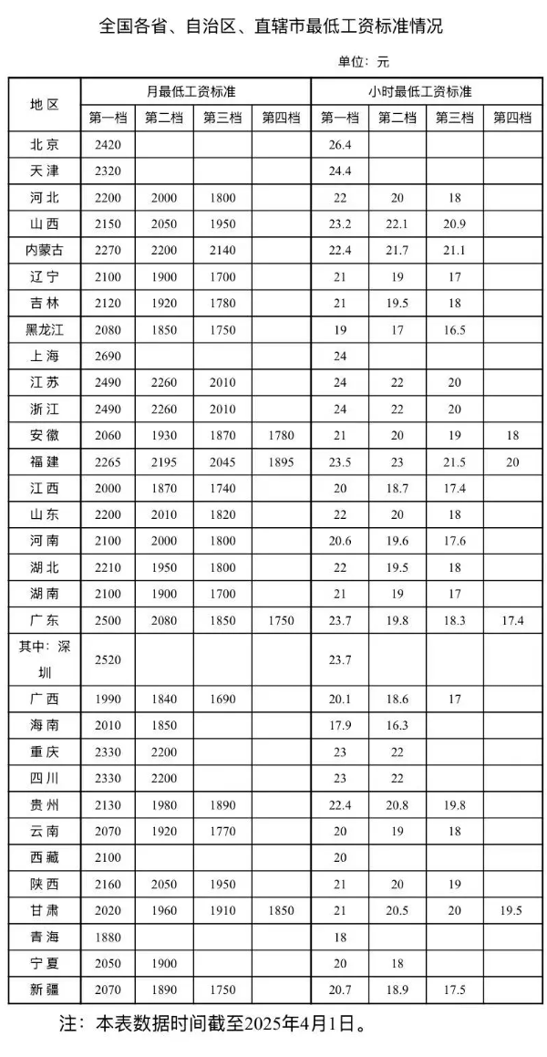 2025-04-06 16:59:43閱讀()中國新聞網(wǎng)人力資源和社會保障部4月3日發(fā)布了全國各省、自治區(qū)、直轄市最低工資標(biāo)準(zhǔn)情況(截至2025年4月1日)。數(shù)據(jù)顯示,目前有21個(gè)省份第一檔月最低工資標(biāo)準(zhǔn)在2100元及以上,有8個(gè)省份第一檔月最低工資標(biāo)準(zhǔn)超過2300元。