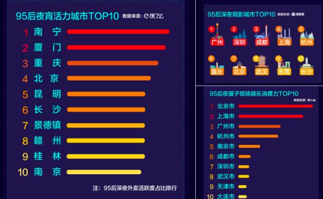 橫向比較95后宵夜活力城市TOP10、95后深夜觀影城市TOP10、95后夜貓子現(xiàn)場娛樂消費力TOP10,入圍城市均以南方城市為主。廣州、上海、杭州、成都、深圳四地95后夜貓子在多個文化消費榜單中處于領(lǐng)先位置,北京是唯一全部入圍的北方城市。