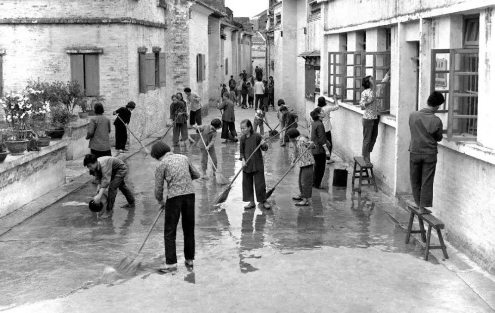 1966年1月17日,全國(guó)衛(wèi)生紅旗單位廣東省佛山市在春節(jié)前夕,又掀起一個(gè)愛(ài)國(guó)衛(wèi)生運(yùn)動(dòng)的高潮。圖為佛山市滘邊街居民在洗刷街道。新華社記者 李開(kāi)遠(yuǎn) 攝