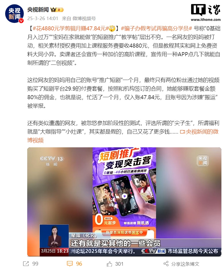央視曝光短劇推廣騙局套路,花4880元學剪輯月賺47.84元