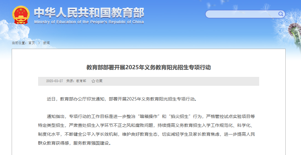 教育部部署開展2025年義務教育陽光招生專項行動近日,教育部辦公廳印發(fā)通知,部署開展2025年義務教育陽光招生專項行動。通知指出,專項行動 ...