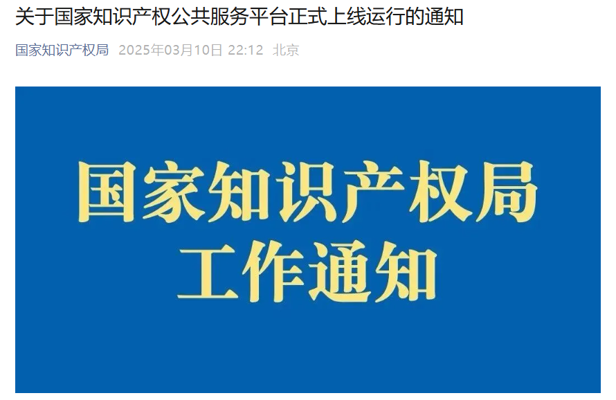 國家知識產(chǎn)權(quán)局發(fā)布《關(guān)于國家知識產(chǎn)權(quán)公共服務(wù)平臺正式上線運行的通知》,平臺定于2025年3月10日正式上線。附通知內(nèi)容如下:各省、自治區(qū) ...