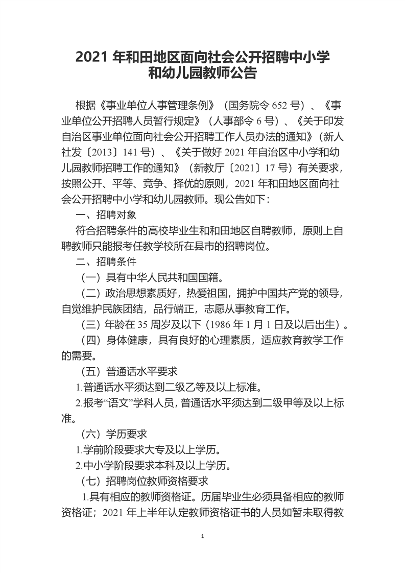 2021年和田地區(qū)面向社會(huì)公開(kāi)招聘中小學(xué)和幼兒園教師公告