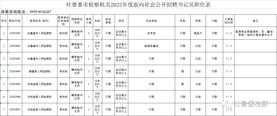 6.招聘崗位、人數(shù)其他具體要求詳見《2022年吐魯番市人民檢察院面向社會公開招聘聘用制書記員職位表》。