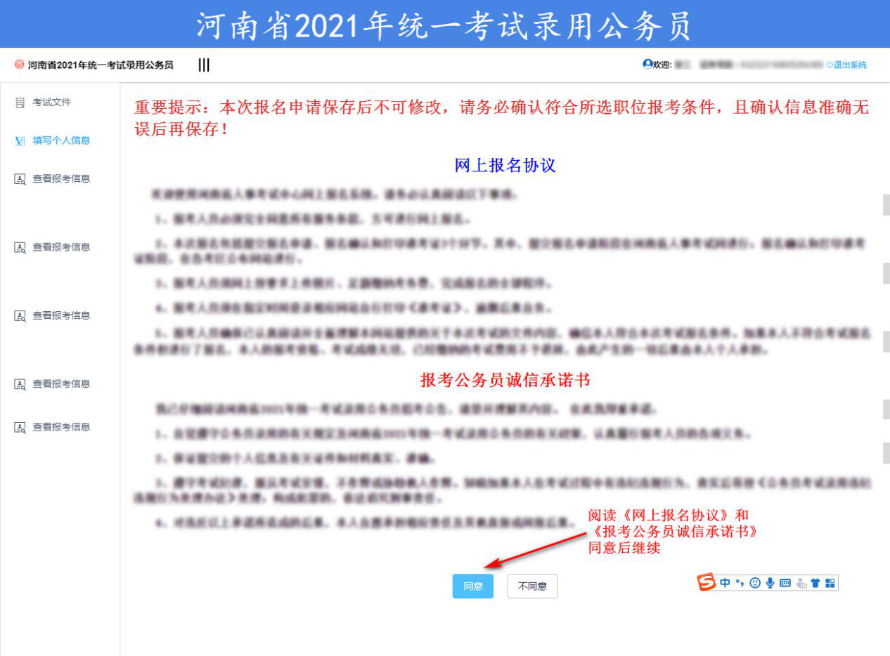 (一)認真閱讀《網(wǎng)上報名協(xié)議》和《報考公務員誠信承諾書》,同意后繼續(xù)。