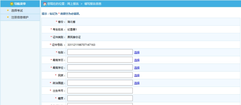 通過點擊接受按鈕,進入考生填寫報名信息的頁面,如下圖所示: