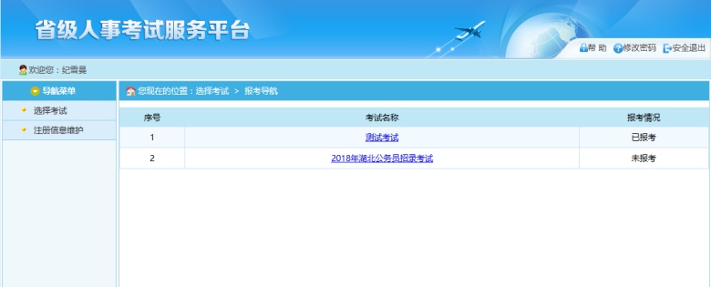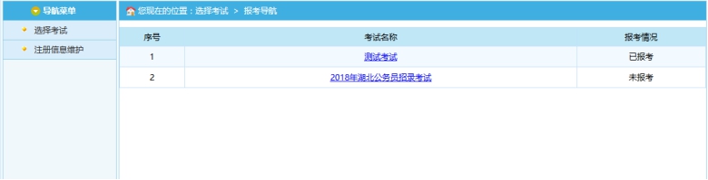通過點擊系統(tǒng)導航菜單中“選擇考試”選項可以跳轉到選擇要報名的考試的頁面,如下圖所示: