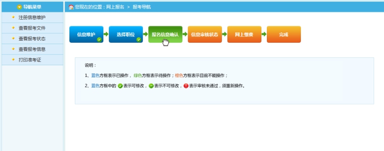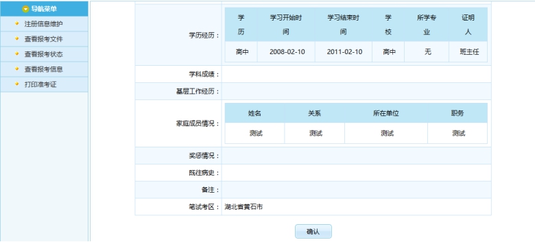 通過點擊“報名信息確認”按鈕后,跳轉到報名信息確認頁面,如下圖所示:
