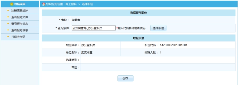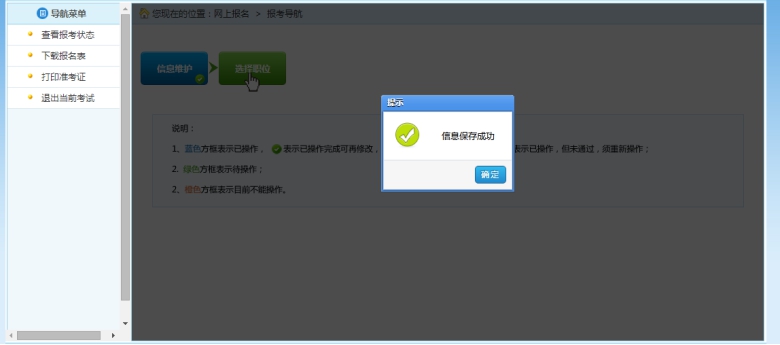 選擇相應的職位,點擊“保存”按鈕,提示保存成功,可以跳轉到報考流程頁面,如下圖所示: