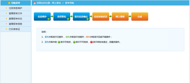 通過點擊系統(tǒng)導航菜單的“查看報考狀態(tài)”選項,可進入查看狀態(tài)頁面,查看職位審核狀態(tài),確定報考情況和審核進度,以免延誤報考。如下圖所示: