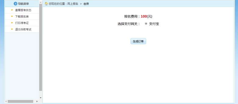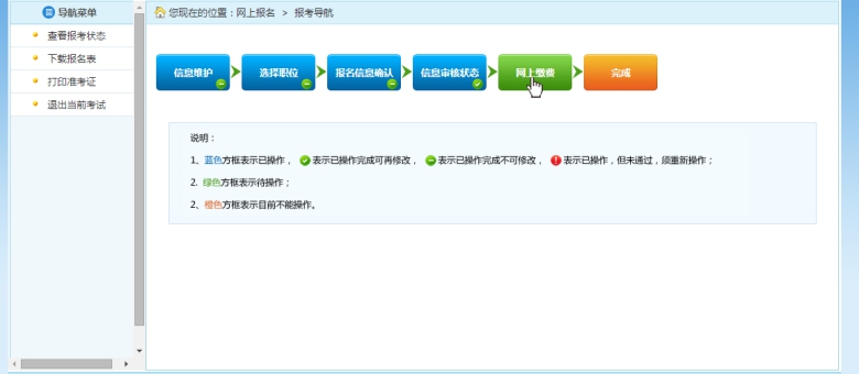 審核通過的考生可以進行網上繳費,點擊報考流程中“網上繳費”選項,可以進入網上繳費的頁面,如下圖所示: