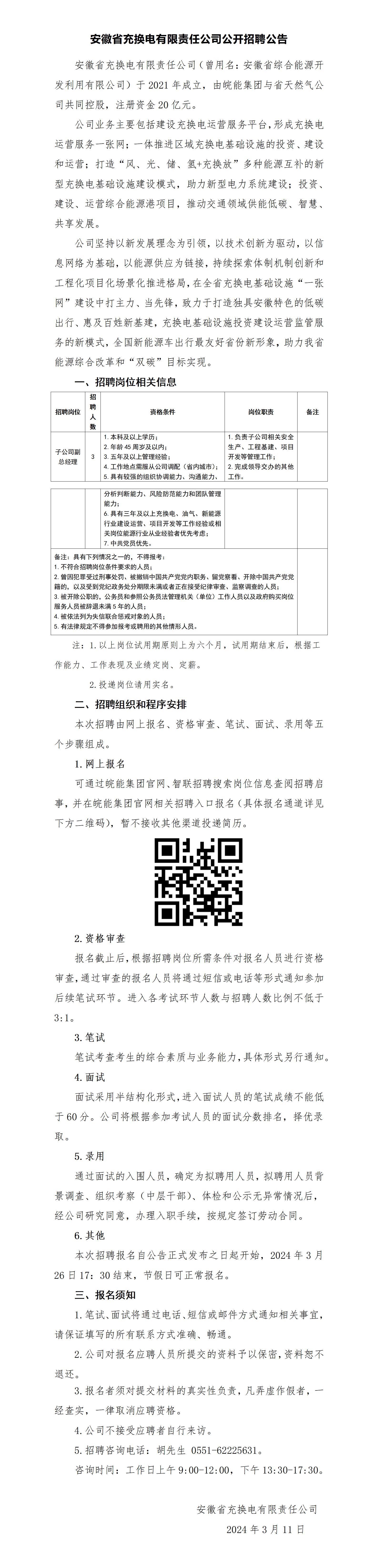 2024年安徽省充換電有限責(zé)任公司公開招聘公告