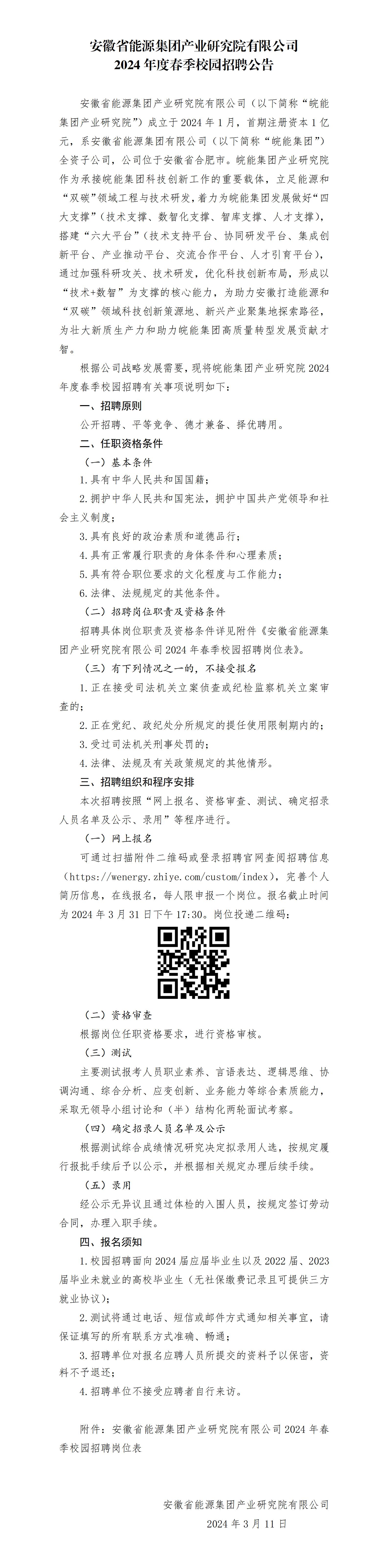 2024年安徽省能源集團產(chǎn)業(yè)研究院有限公司春季校園招聘公告