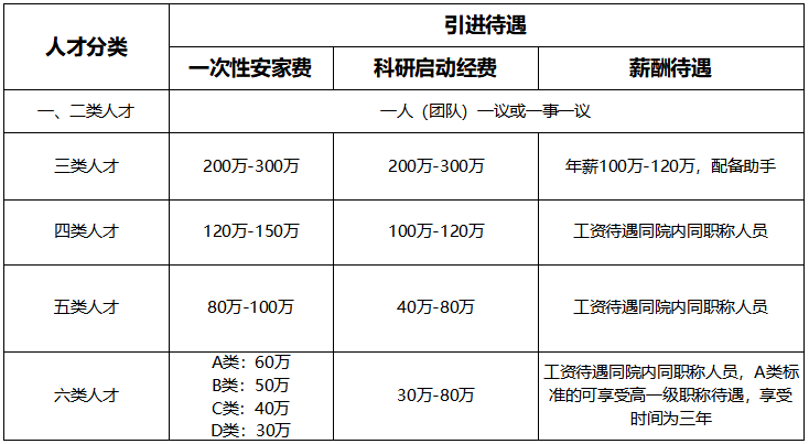 積極鼓勵引進人才團隊,實行“一事一策”,團隊成員按同層次人才上浮 10% 享受待遇;團隊科研啟動經費300-600 萬元。或按照團隊人才類型對應的科研啟動經費累計計發(fā)。