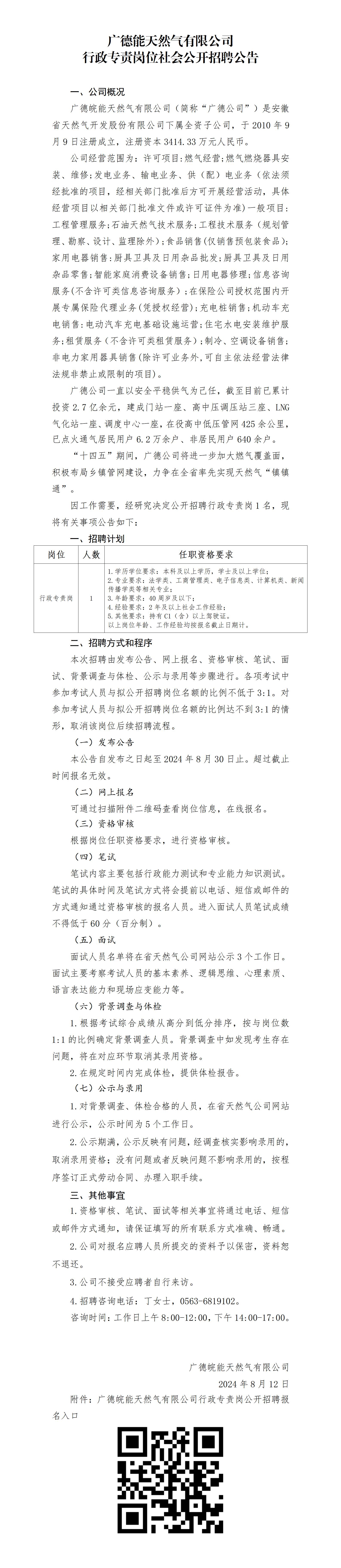 2024年宣城廣德皖能天然氣有限公司行政專責崗位社會公開招聘公告