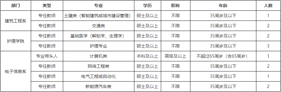 1、專業(yè)、學(xué)歷、職稱條件詳見(jiàn)表格,有職稱、教學(xué)經(jīng)驗(yàn)或有企業(yè)工作經(jīng)歷并取得職業(yè)資格證書(shū)者優(yōu)先。