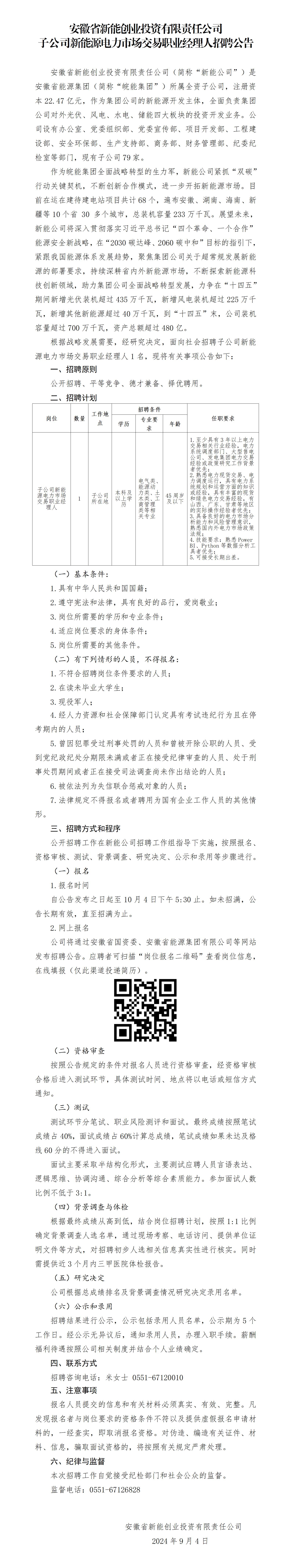 2024年安徽省新能創(chuàng)業(yè)投資有限責(zé)任公司子公司新能源電力市場(chǎng)交易職業(yè)經(jīng)理人招聘公告