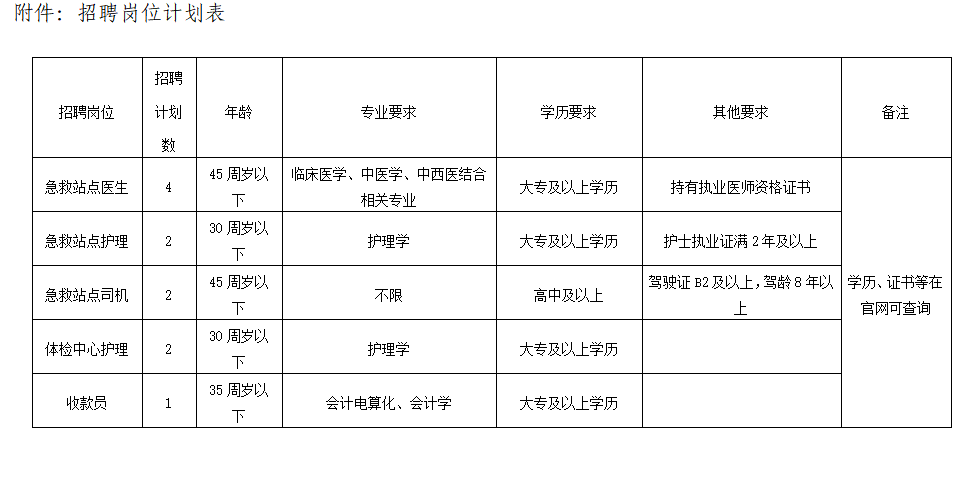 招聘急救站點醫(yī)生4人,急救站點護(hù)理2人,急救站點司機(jī)2人,體檢中心護(hù)理2人,收款員1人,合計11人,具體招聘崗位要求詳見附件。