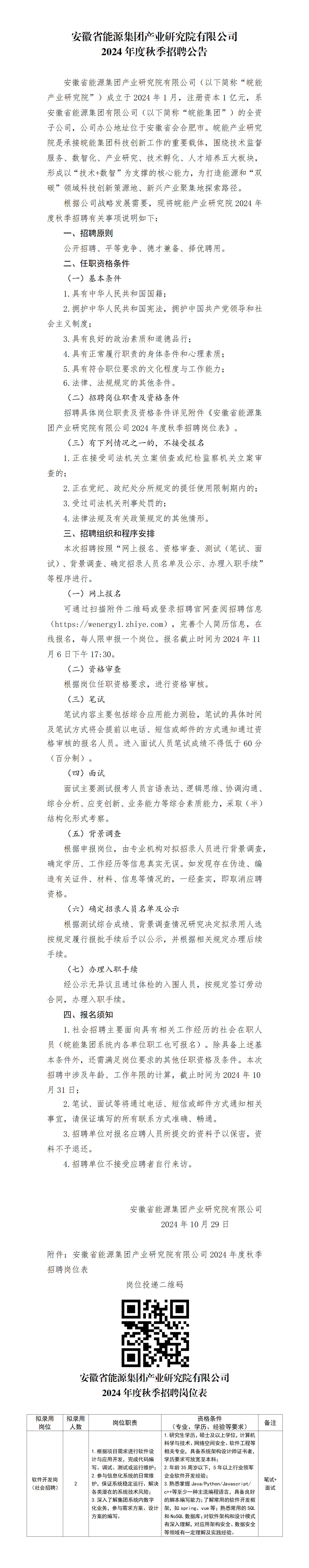 根據(jù)公司戰(zhàn)略發(fā)展需要,現(xiàn)將皖能產(chǎn)業(yè)研究院2024年度秋季招聘有關(guān)事項(xiàng)說明如下: