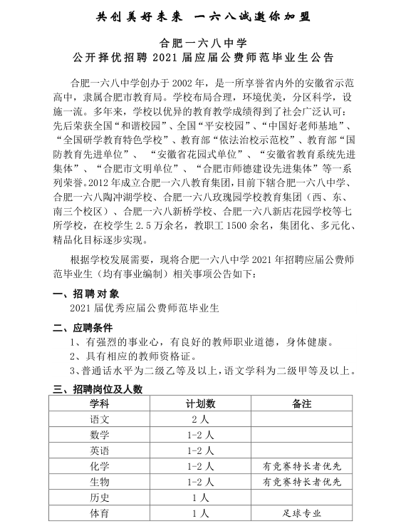 根據(jù)學(xué)校發(fā)展需要,現(xiàn)將合肥一六八中學(xué)2021年招聘應(yīng)屆公費(fèi)師范畢業(yè)生(均有事業(yè)編制)相關(guān)事項(xiàng)公告如下:
