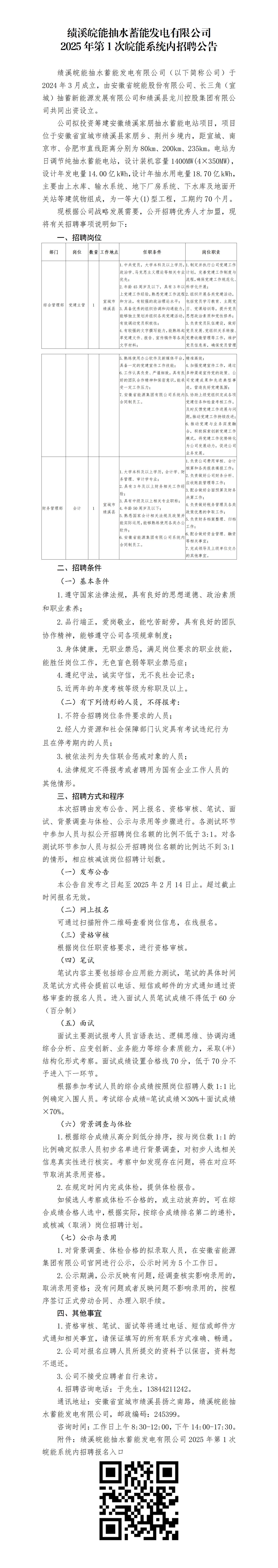 2025年宣城績溪皖能抽水蓄能發(fā)電有限公司第1次皖能系統(tǒng)內(nèi)招聘公告